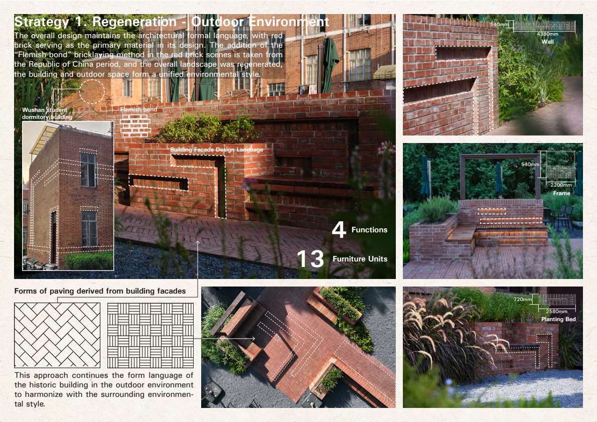 整体风貌协调:项目协调乙组膳堂历史环境的原有风貌,在整体设计上延续了原国立中山大学建筑的形式语言,以红砖作为主要设计材料,新增红砖景墙序列采用民国“梅花丁”砌法,与原国立中山大学建筑红砖建筑语言相呼应,保护了五山学生宿舍区建设控制地带内的整体环境风貌。