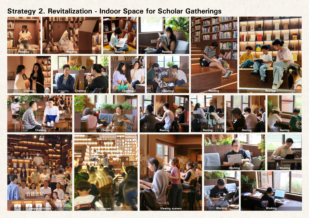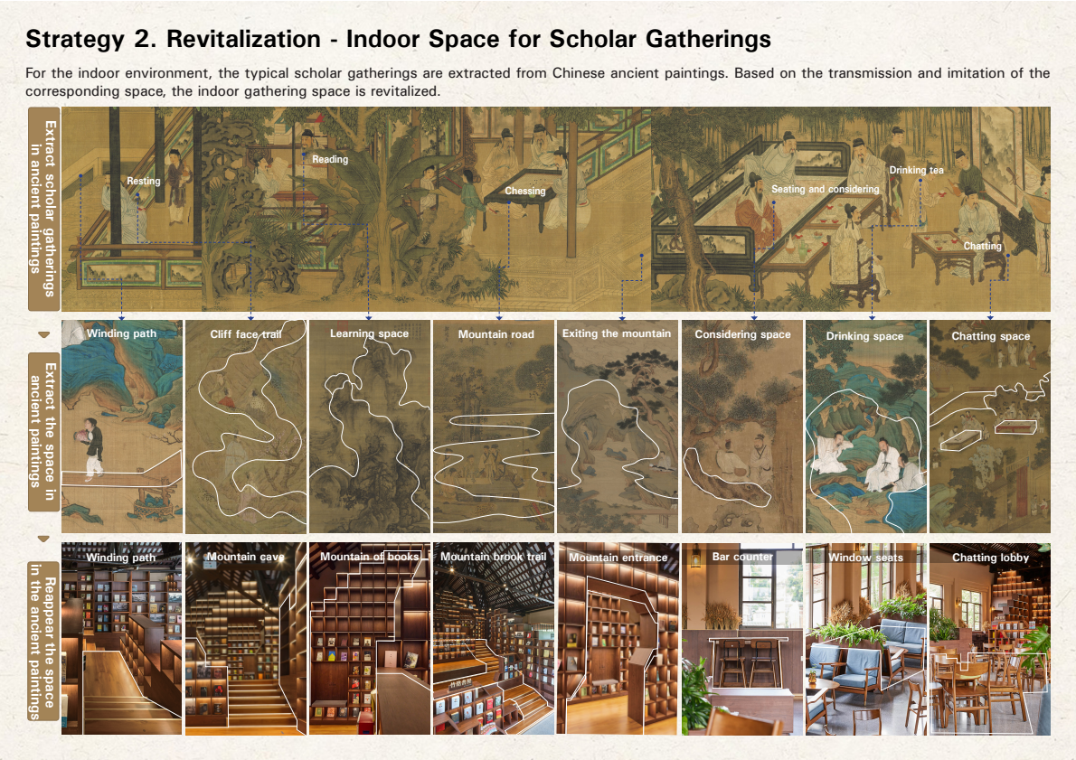 室内空间活化:以风景园林手法介入建筑更新,将室内空间园林化,以“画意营境”为设计方法,以“藏书园林”为设计定位,基于对中国传统山水画中山川意象与中国古典园林假山空间的传移模写,打造多功能复合的室内“书山”。设计基于乙组膳堂历史建筑模数,确定书山基本模块单元尺度,形成与建筑空间相调和的山形山势。设计后的室内空间可利用率增加了三分之一,兼具行、望、居、游等综合功能,为校园师生提供了功能复合的室内文化生活空间。