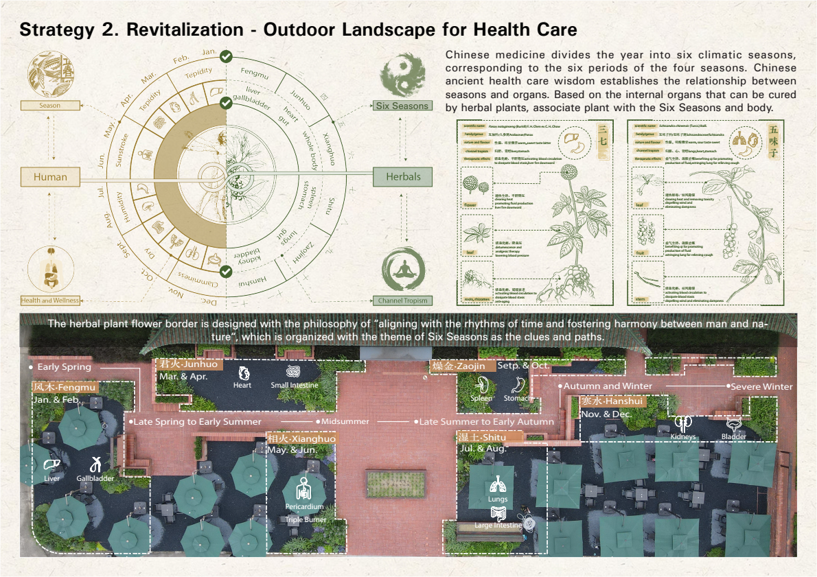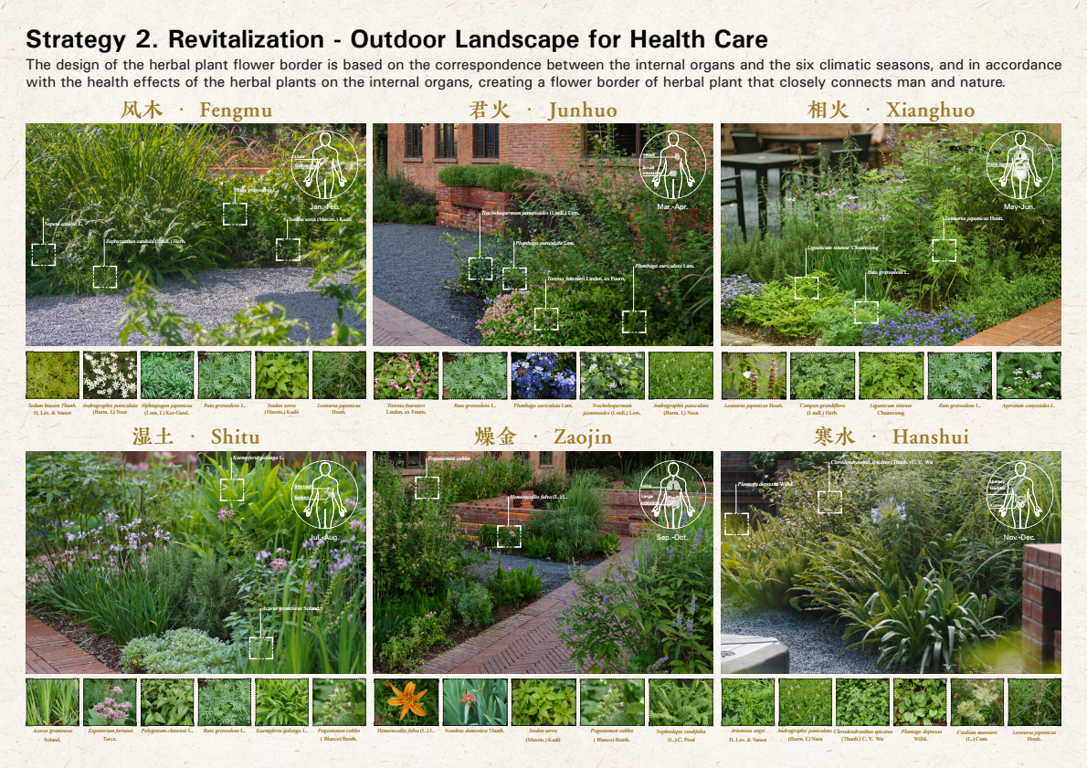 户外环境再生:户外环境再生设计以顺时合序、人与天调为原则,以四时六气为花境主题,选用岭南本草植物营造本草花境。