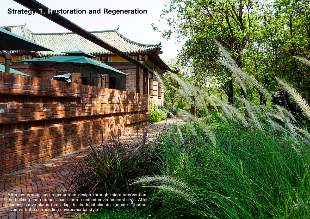 项目以国立中山大学石牌旧址建筑乙组膳堂保护修缮与活化再生为设计目标,以华农酸奶文化馆为功能定位,传承华农文脉,弘扬校园文化,以风景园林手法主导整体历史环境更新,激活紧邻学生社区的荒废历史空间,营造服务师生的校园文化生活场所。