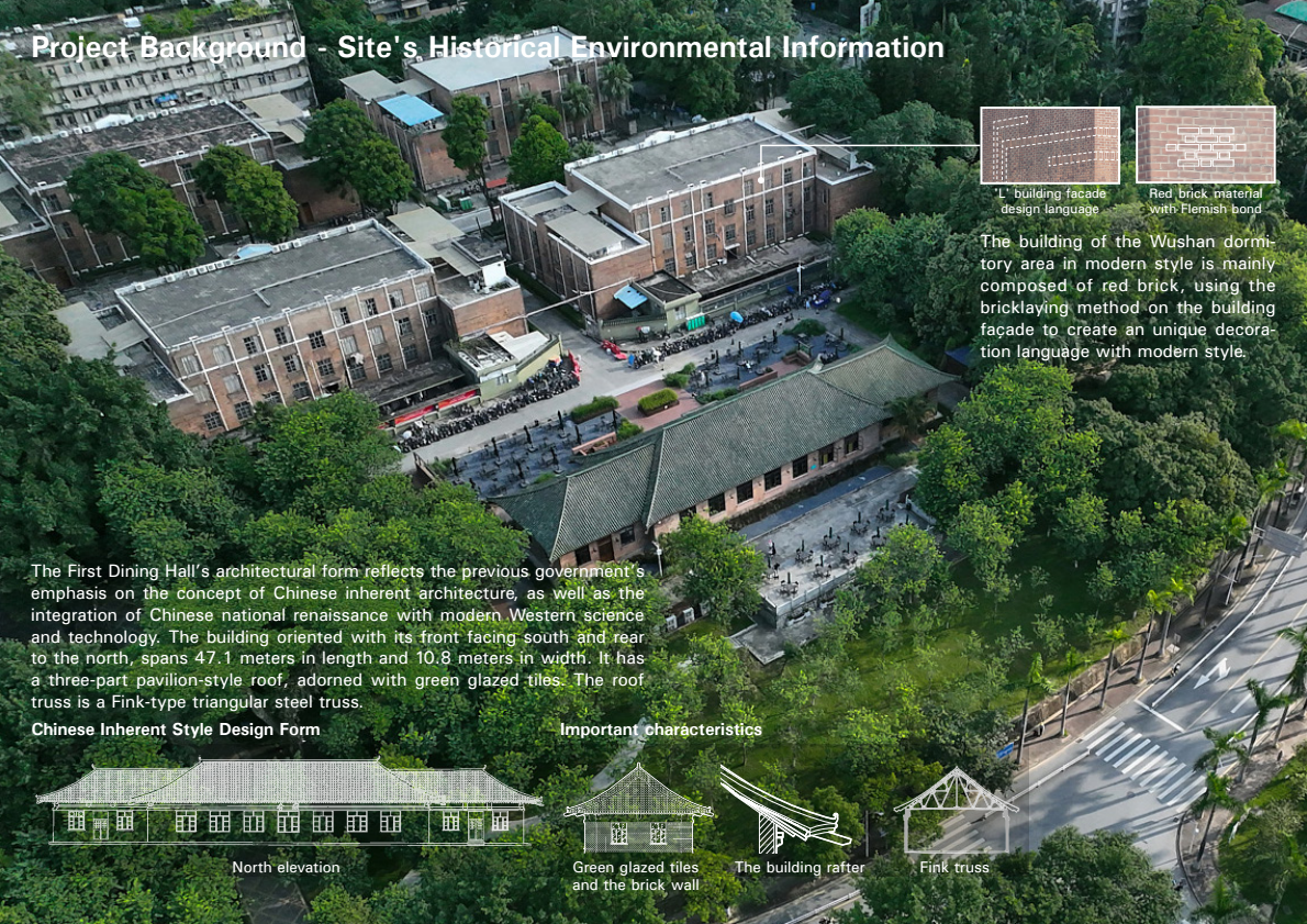 项目背景:华南农业大学乙组膳堂,始建于1935年,原为国立中山大学最早修建的学生膳堂,该建筑位于现华南农业大学五山学生宿舍区内,由著名的“万金油大王”胡文虎、胡文豹兄弟捐建。乙组膳堂与原国立中山大学农学院农学馆、理学院等建筑同属于国立中山大学石牌旧址建筑群,于2002年7月被列为广州市第六批文物保护单位。