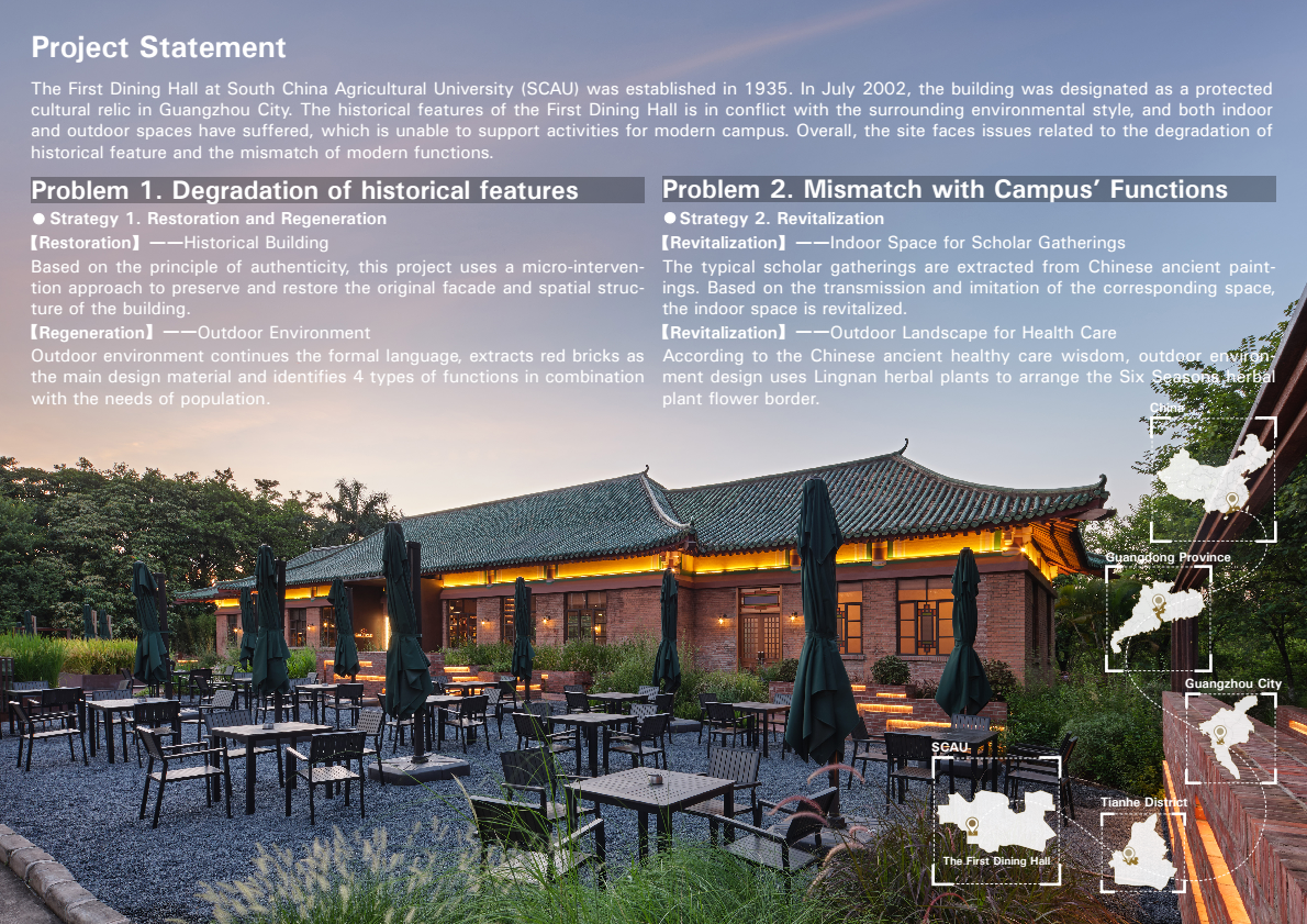 项目名称:Restoration, Regeneration and Revitalization Design for the First Dining Hall of SCAU,中文名称为“华南农业大学乙组膳堂(华农酸奶文化馆)保护修缮及活化再生设计”