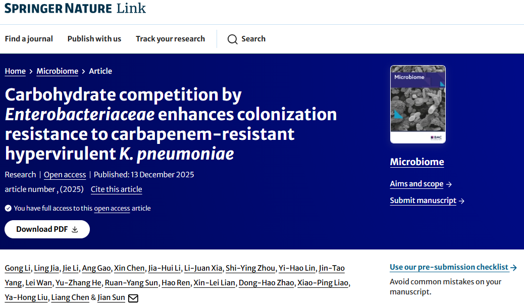 近日,兽医学院、国家兽医微生物耐药性风险评估实验室、广东省兽药研制与安全评价重点实验室的孙坚教授团队在耐药菌防控领域取得重要进展,其研究成果发表在中科院微生物学一区Top期刊Microbiome(五年影响因子16.6)上,论文题为“Carbohydrate competition by Enterobacteriaceae enhances colonization resistance to carbapenem-resistant hypervirulent K. pneumoniae”。