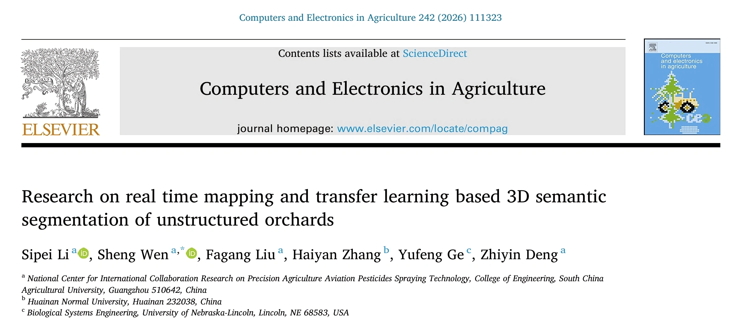 近日,工程学院硕士研究生李斯培以第一作者身份在在国际知名期刊Computers and Electronics in Agriculture(中科院一区Top期刊,影响因子8.9)发表题为“Research on Real Time Mapping and Transfer Learning Based 3D Semantic Segmentation of Unstructured Orchards”的研究论文。论文依托团队自主研发的智能感知无人飞行平台,该平台集成了激光雷达(LiDAR)、高精度全球导航卫星系统(GNSS)、惯性测量单元(IMU)等多源传感器,提出并实现了名为LIG-LIO的紧耦合激光雷达SLAM(Simultaneous Localization and Mapping),构建了面向非结构化果园环境的实时定位建图和语义地图生成系统,为丘陵山地非结构化果园三维点云地图的重建和语义映射提供了一种高效、准确的解决方案。