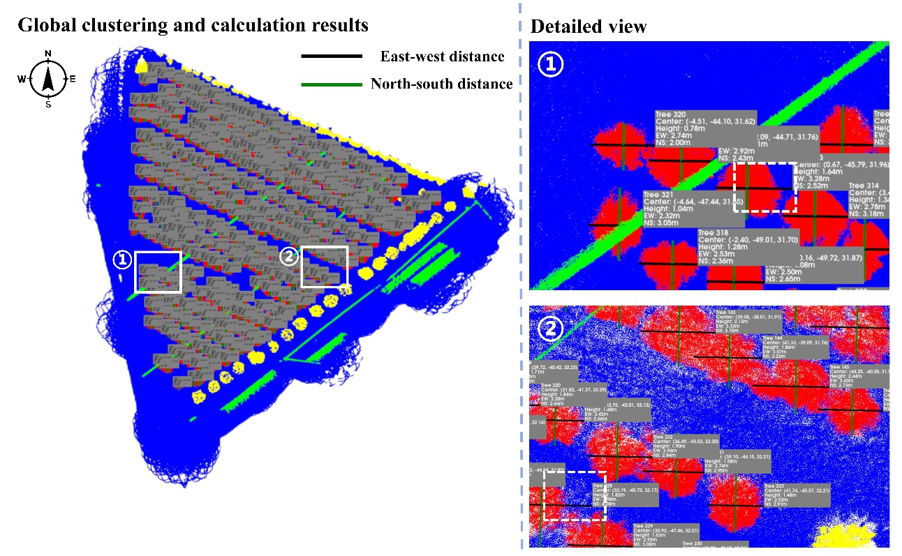 在环境理解与目标识别方面,研究引入了迁移学习策略:先利用PointNet++模型在大型公开三维点云数据集上进行预训练,使模型充分学习通用的空间几何特征与场景语义信息;再结合采集到的小样本果园点云数据进行微调与再训练,使模型能够针对果树、地面及人造设施等典型目标实现更为精准的识别与三维语义分割。基于分割得到的果树点云,研究进一步引入聚类与几何分析方法,实现单株果树的自动分割与编号,并自动计算每棵树的株高、冠幅以及中心位置等关键几何参数,完成由原始感知数据向结构化果树表型信息的自动化转换。研究结果表明,所构建的系统在复杂地形非结构化果园中的建图精度、语义分割精度以及单株参数提取稳定性方面均表现良好,可为果园生长监测、精准施药、产量评估等智能化管理任务提供可靠的数据支撑和技术保障。