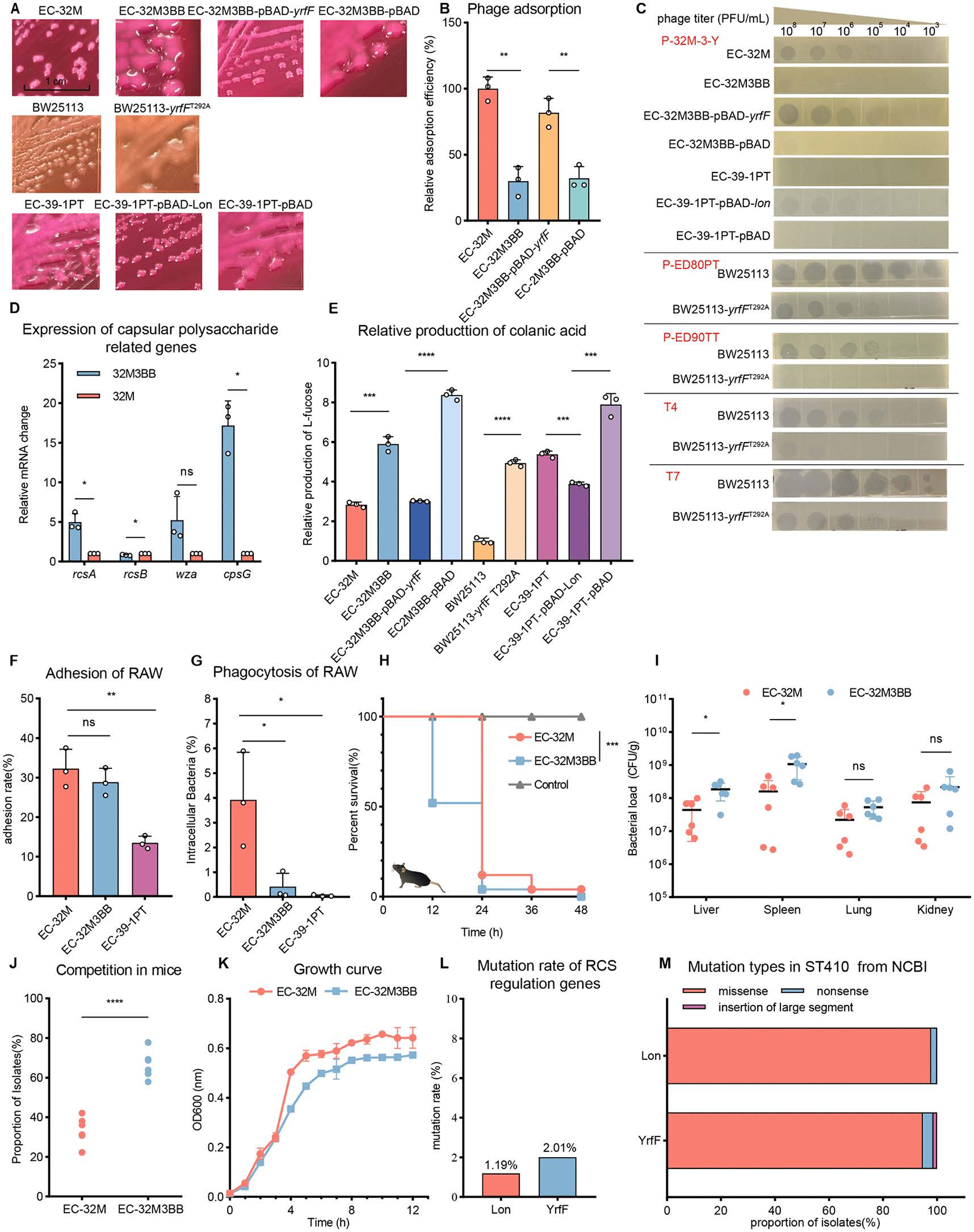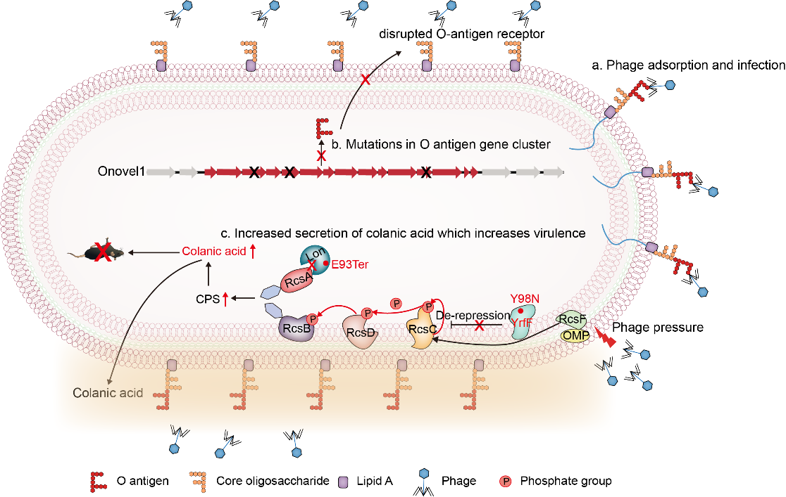该研究围绕“噬菌体抗性进化是否会影响细菌毒力”这一关键科学问题,以在全球各生态位广泛传播的高风险克隆株E. coli ST410为研究对象,系统解析了细菌在噬菌体压力下获得抗性的分子机制及其生物学后果。研究发现,除了通过噬菌体受体突变介导噬菌体抗性外,细菌可通过大量上调胞外多糖--可拉酸(colanic acid)合成,在细胞表面形成保护性屏障,从而有效阻断噬菌体的吸附与侵染,产生稳定的噬菌体抗性表型。值得注意的是,可拉酸分泌增多不仅影响噬菌体-细菌相互作用,还可增强细菌对宿主免疫细胞的抵御能力,从而提高细菌的毒力。