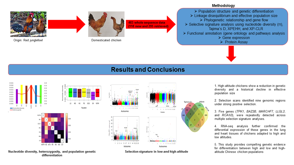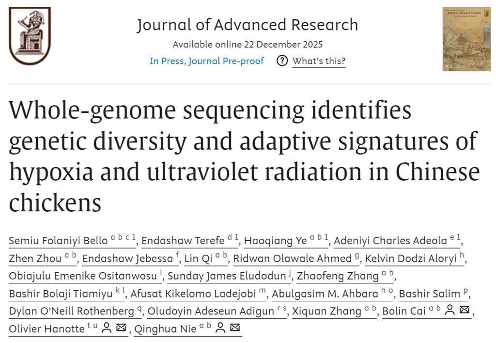 近日,动物科学学院家禽遗传育种研究团队在Journal of Advanced Research(中科院一区TOP期刊,最新影响因子13)在线发表了题为“Whole-genome sequencing identifies genetic diversity and adaptive signatures of hypoxia and ultraviolet radiation in Chinese chickens”的研究论文,为高/低海拔鸡种的种群分化提供了遗传学证据。