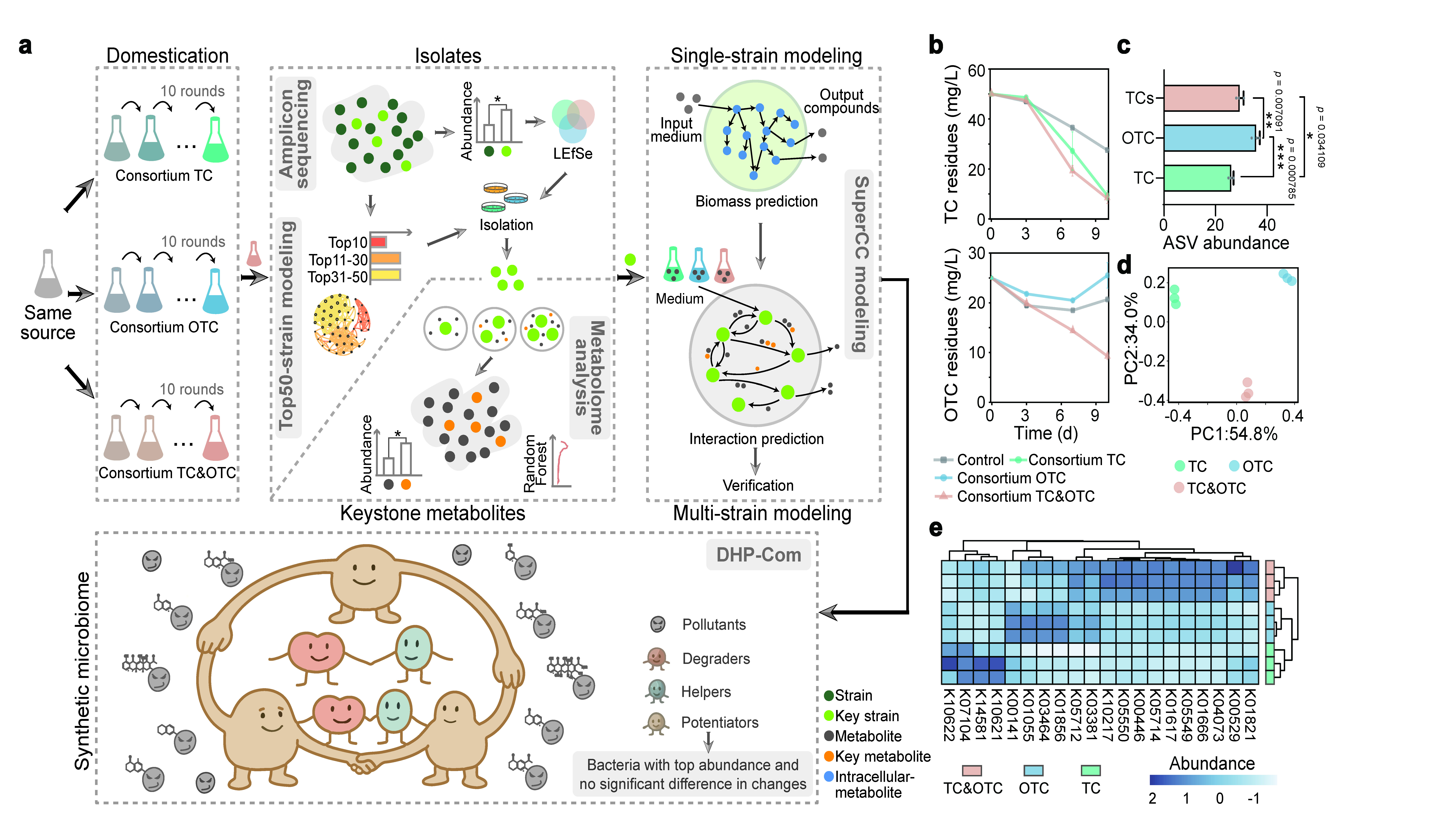 研究通过整合多组学数据与代谢建模分析,揭示了复合污染胁迫下菌群协同作用的关键驱动机制。结果表明,具有广谱资源利用能力的菌株通过分泌特异性代谢产物,在群落中发挥“增效”作用,是促进菌群协同降解的重要物质基础,不仅仅提高整个群落的生物量,还增强了菌群的降解功能;同时,本土关键菌株在维持群落结构稳定性和功能持续性方面具有不可替代的核心作用。在此基础上,研究创新性提出了“降解菌—辅助菌—增效菌”协同构建的合成菌群设计范式(DHP-Com),显著提升了合成微生物组在多类型复合污染场景下的修复效率与生态适应性。