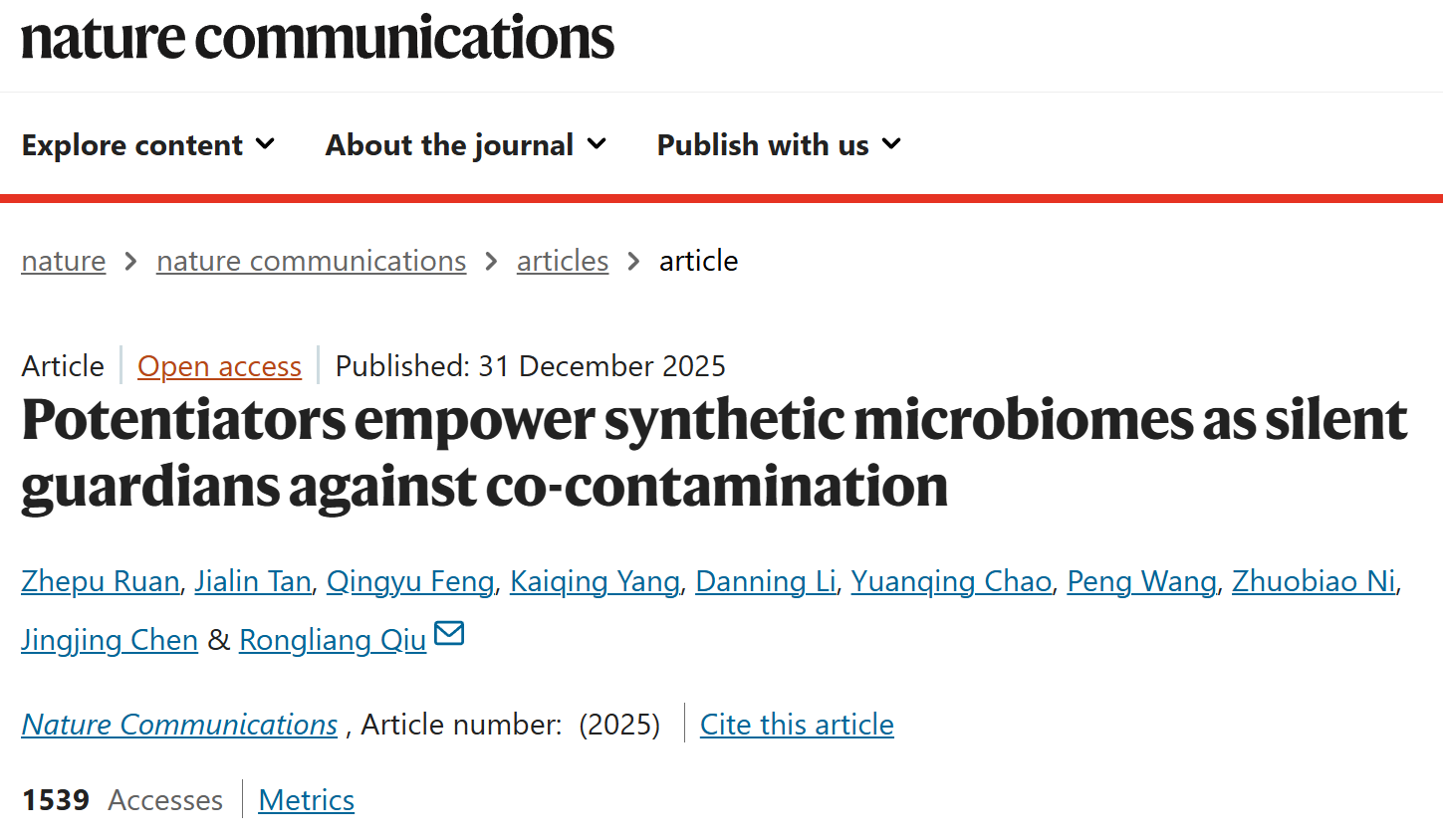 近日,资源环境学院仇荣亮教授团队在Nature杂志子刊Nature Communications(中科院1区,5年影响因子17.2)在线发表题为“Potentiators empower synthetic microbiomes as silent guardians against co-contamination”的研究论文。该研究围绕复杂有机污染情景下合成微生物组的理性构建与功能强化,提出了一种全新的菌群设计范式,为高效、稳定的环境生物修复提供了重要理论依据与技术支撑。