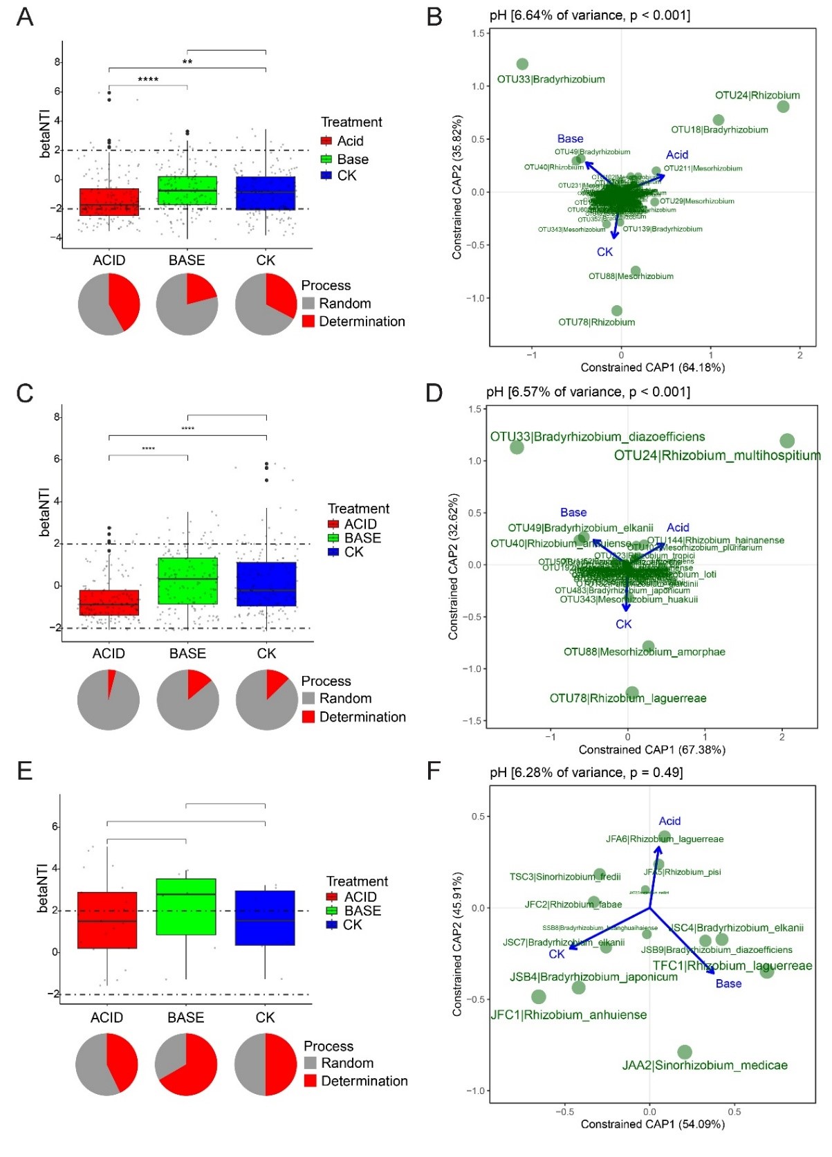 根瘤菌作为豆科植物的共生固氮伙伴,在农业氮循环中扮演着关键角色,贡献了农业系统中65%以上的生物固氮量。然而,与根瘤内根瘤菌的深入研究相比,根际根瘤菌群落的生态驱动因子,特别是在环境扰动下的响应机制尚不明确。土壤pH作为微生物活性的“主调控因子”,对根瘤菌的分布和功能具有重要影响,但其在物种水平上调控根瘤菌群落组装的具体机制仍有待阐明。