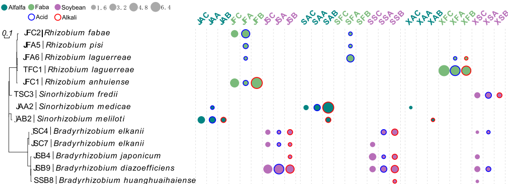 图2 pH处理下苜蓿、蚕豆和大豆根瘤中根瘤菌群落的系统发育气泡图