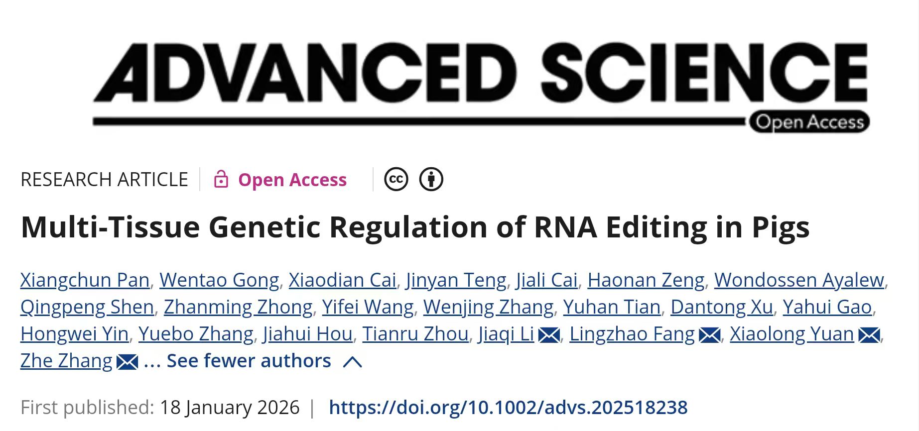 近日,猪禽种业全国重点实验室、岭南现代农业科学与技术广东省实验室、广东省农业动物基因组学与分子育种重点实验室、华南农业大学动物科学学院张哲教授团队与国内外多个研究团队在国际权威期刊Advanced Science(影响因子15.6)上发表了题为“Multi-tissue Genetic Regulation of RNA Editing in Pigs”的研究论文。该研究确立了RNA编辑鉴定流程,基于国际家养动物研究计划FarmGTEx-PigGTEx项目的5,457个RNA-seq样本,成功构建了覆盖猪34个组织的RNA编辑图谱;系统开展猪RNA编辑数量性状基因座(edQTL)分析,绘制了RNA编辑遗传调控效应图谱;通过与猪性状GWAS整合分析策略,为理解基因的转录后调控参与猪复杂性状形成提供了新证据。