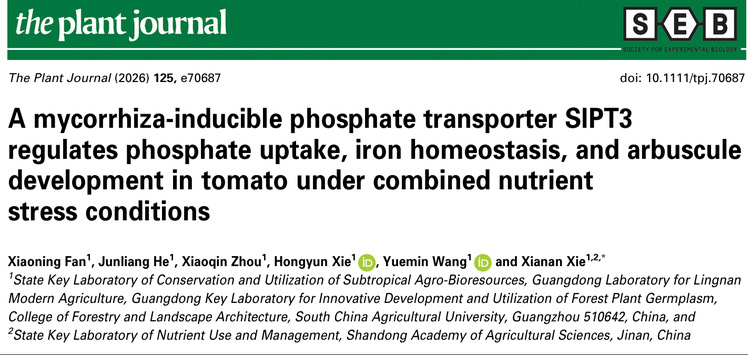 近日,林学与风景园林学院、亚热带农业生物资源保护与利用国家重点实验室、岭南现代农业科学与技术广东省实验室谢贤安课题组在植物营养与菌根共生领域取得重要进展。该研究首次揭示了番茄丛枝菌根诱导表达的磷酸盐转运蛋白SlPT3在缺锌或磷、锌营养同时匮乏条件下,不仅参与菌根途径磷的吸收,还调控铁稳态和丛枝菌根的发育,为理解菌根植物在多重营养缺乏条件下的适应机制提供了新视角。相关研究成果在The Plant Journal(中科院一区Top期刊)在线发表了题为A mycorrhiza-inducible phosphate transporter SlPT3 regulates phosphate uptake, iron homeostasis, and arbuscule development in tomato under combined nutrient stress conditions的研究论文(论文链接:https://doi.org/10.1111/tpj.70687)。