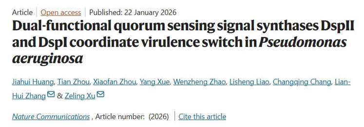 近日,我校群体微生物研究中心张炼辉/徐泽凌团队在国际知名期刊Nature Communications上发表了题为“Dual-functional quorum sensing signal synthases DspII and DspI coordinate virulence switch in Pseudomonas aeruginosa”的科研论文,揭示了铜绿假单胞菌通过DSF家族群体感应信号调控其急性-慢性致病模式转换的作用机制。