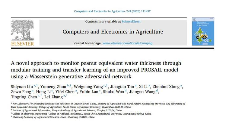在《Computers and Electronics in Agriculture》期刊上在线发表题为 “A novel approach to monitor peanut equivalent water thickness through modular training and transfer learning of an improved PROSAIL model using a Wasserstein generative adversarial network” (论文链接:https://doi.org/10.1016/j.compag.2026.111437)的研究论文。研究团队通过整合Wasserstein生成对抗网络(WGAN)优化的PROSAIL物理模型与模块化迁移学习策略,成功构建了具备强迁移能力的花生冠层等效水厚度(EWT)混合监测模型(WPLEH),有效克服了传统遥感模型对大量实测数据的依赖及跨环境适应性差的难题,为作物水分精准管理、抗旱生理监测及农业可持续发展提供了重要的技术支撑和监测新方法。华南农业大学农学院博士研究生刘仕元和华南农业大学电子工程学院博士后杨炜光为该论文共同第一作者,农学院张雷副研究员和陈婷婷副教授为论文共同通讯作者。