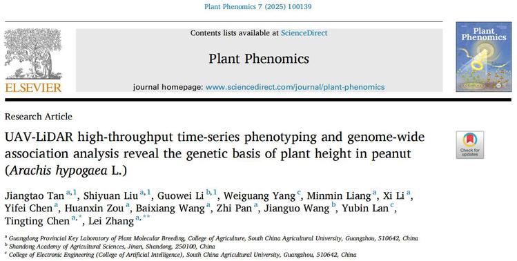 在《Plant Phenomics》期刊上在线发表题为 “UAV-LiDAR high-throughput time-series phenotyping and genome-wide association analysis reveal the genetic basis of plant height in peanut (Arachis hypogaea L.)” (论文链接:https://doi.org/10.1016/j.plaphe.2025.100139)的研究论文。研究团队通过整合无人机激光雷达(UAV-LiDAR)时间序列表型分析与全基因组关联分析(GWAS),成功筛选出与花生株高(PH)相关的潜在候选基因Arahy.1026BX,为花生株型优化、抗倒伏改良和机械化适应性提升等精准智能育种提供了重要的基因资源和功能靶点。农学院博士研究生谭江滔、刘仕元和山东省农业科学院李国卫研究员为该论文第一作者,农学院张雷副研究员和陈婷婷副教授为论文通讯作者。