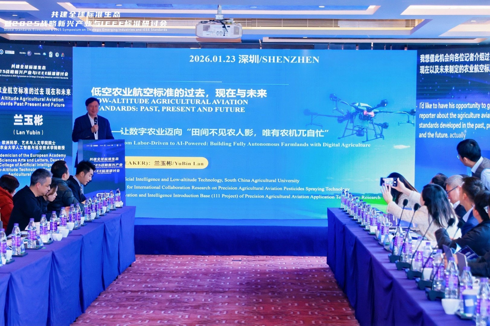 近日,共建全球标准生态暨2026战略新兴产业与IEEE标准研讨会在深圳举办。学校人工智能与低空技术学院教授、国家精准农业航空施药技术国际联合研究中心主任和首席科学家兰玉彬受邀参会并作主旨报告。