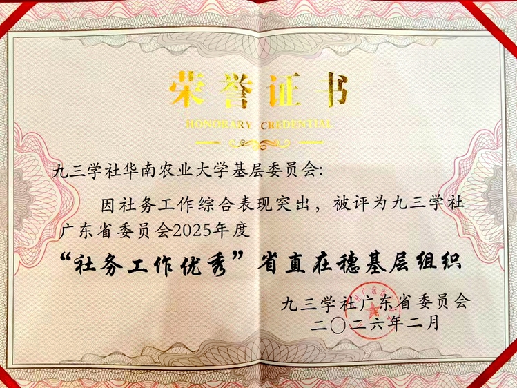 近日,九三学社广东省委员会召开省直在穗基层组织年度工作总结交流会。经过书面初审与现场汇报两轮评审,九三学社省直华南农业大学基层委员会在53个参评组织中名列前茅,以高分成绩获评2025年度“社务工作优秀”省直在穗基层组织。