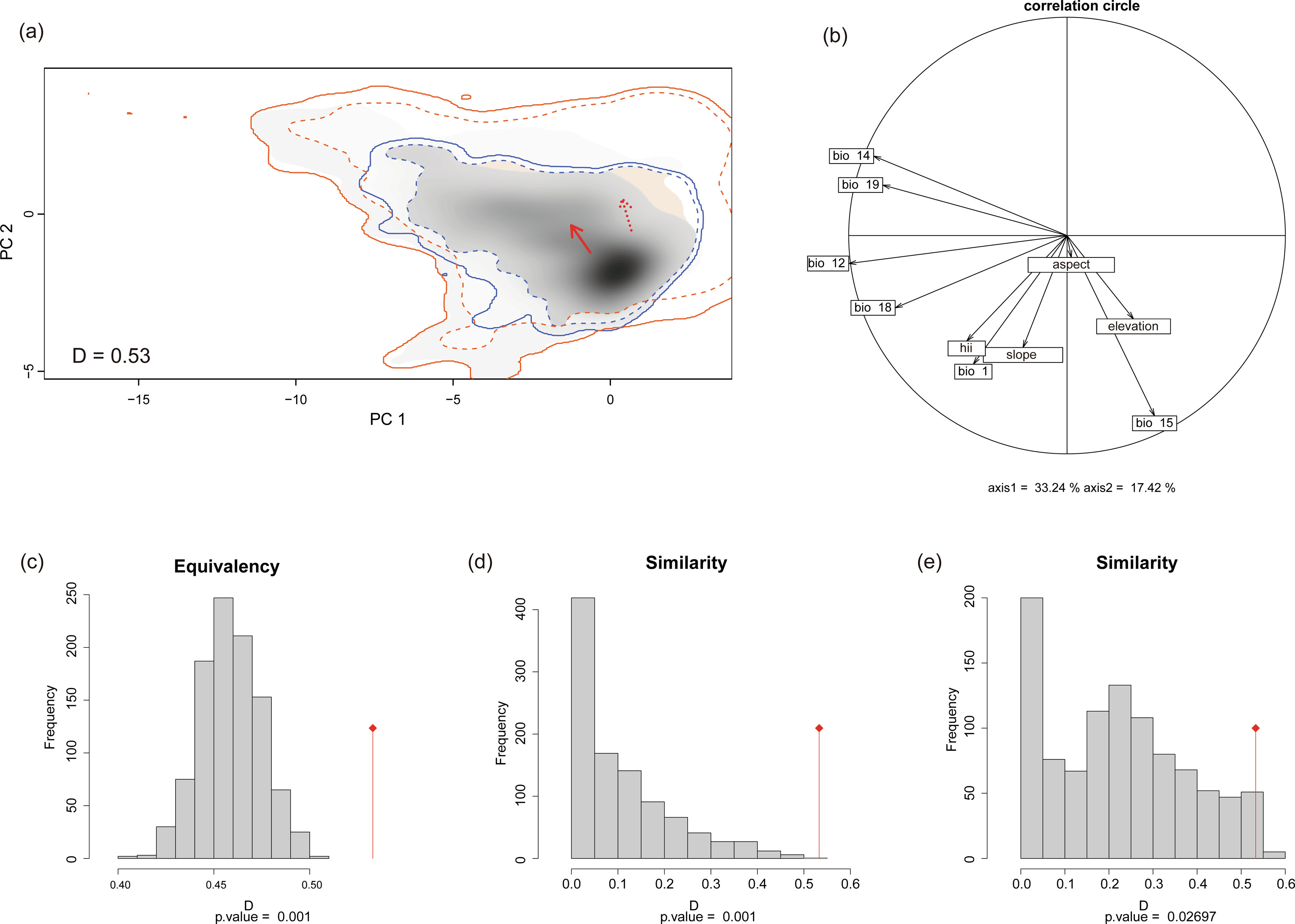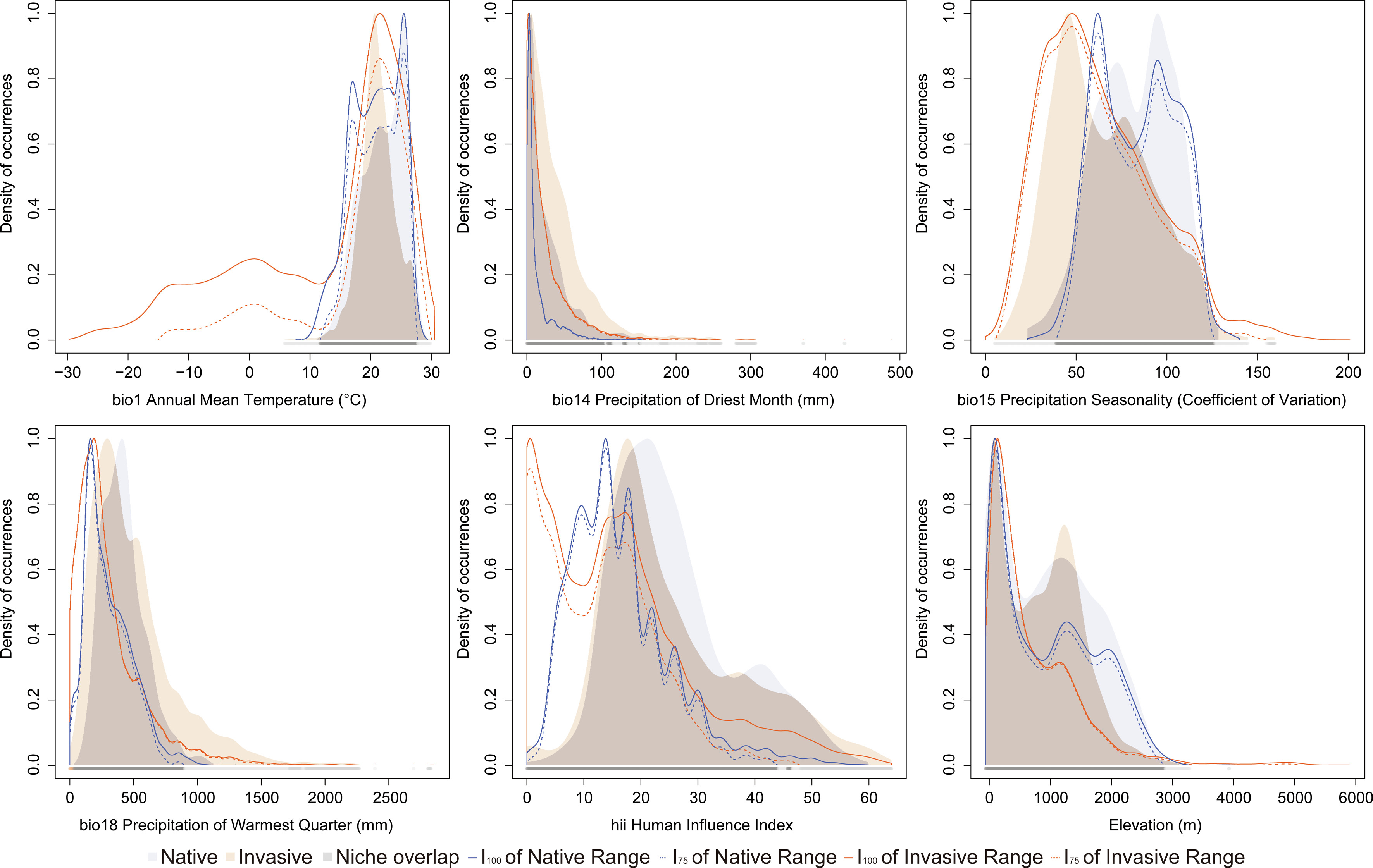 研究证实,肿柄菊(T. diversifolia)在入侵过程中整体表现出强烈的生态位保守性,仅向更干燥、更高海拔以及更高人类干扰的区域有限扩张。基于全球分布数据构建的物种分布模型,其预测准确性显著优于仅基于原产地或入侵地数据的模型,能更全面地捕捉物种的生态耐受性。未来气候情景下,肿柄菊的全球总体适宜生境面积将呈减少趋势,仅在中国南部、东南亚及中美洲等分布区边缘地带出现碎片化扩张,并向中高纬度地区移动。扩散模型模拟结果显示,即便存在较强扩散障碍,在不同扩散情景下其占据面积仍可扩张40倍以上,表明其入侵潜力主要由气候适宜性和自身扩散能力驱动,当前的实际分布远未达到饱和。