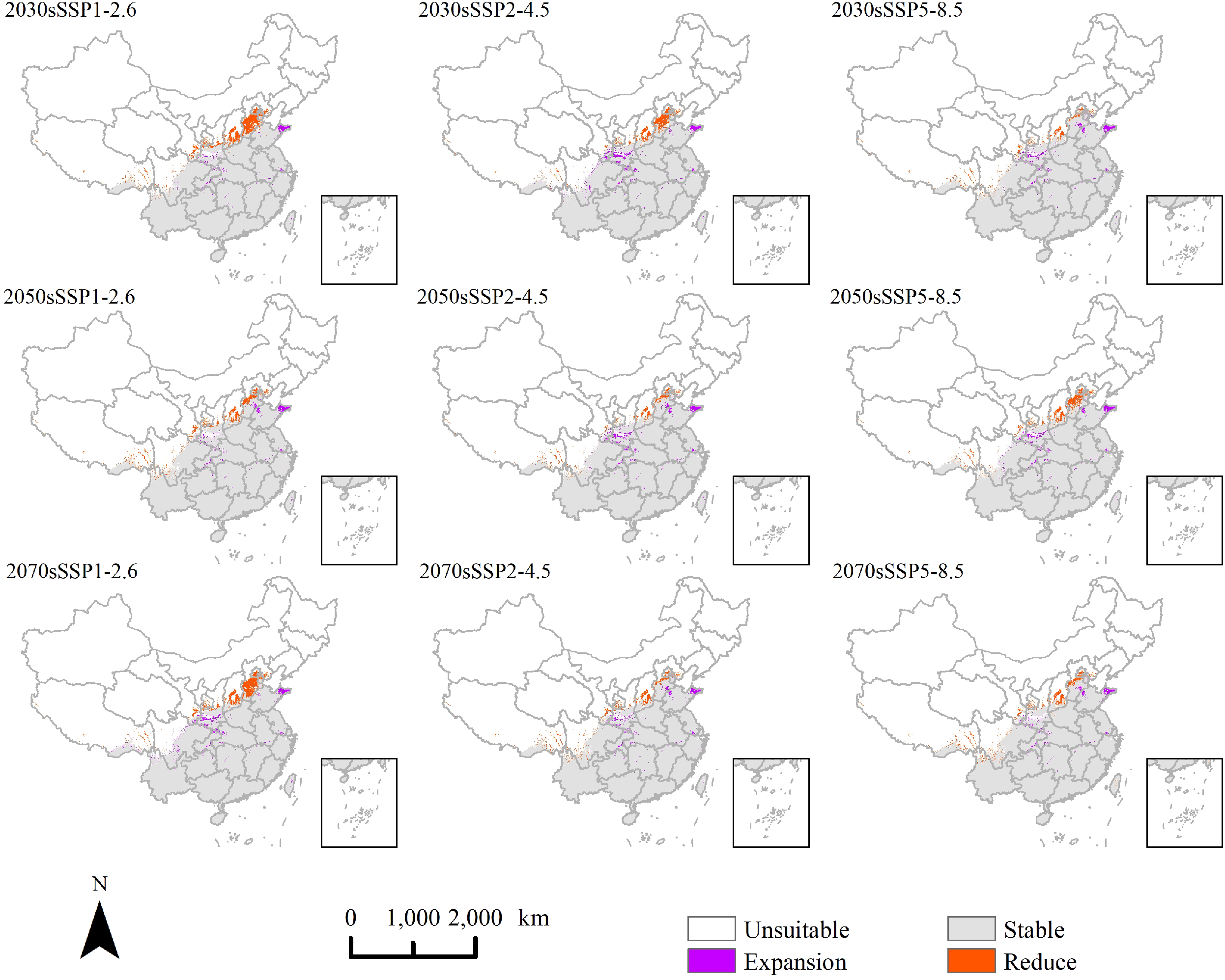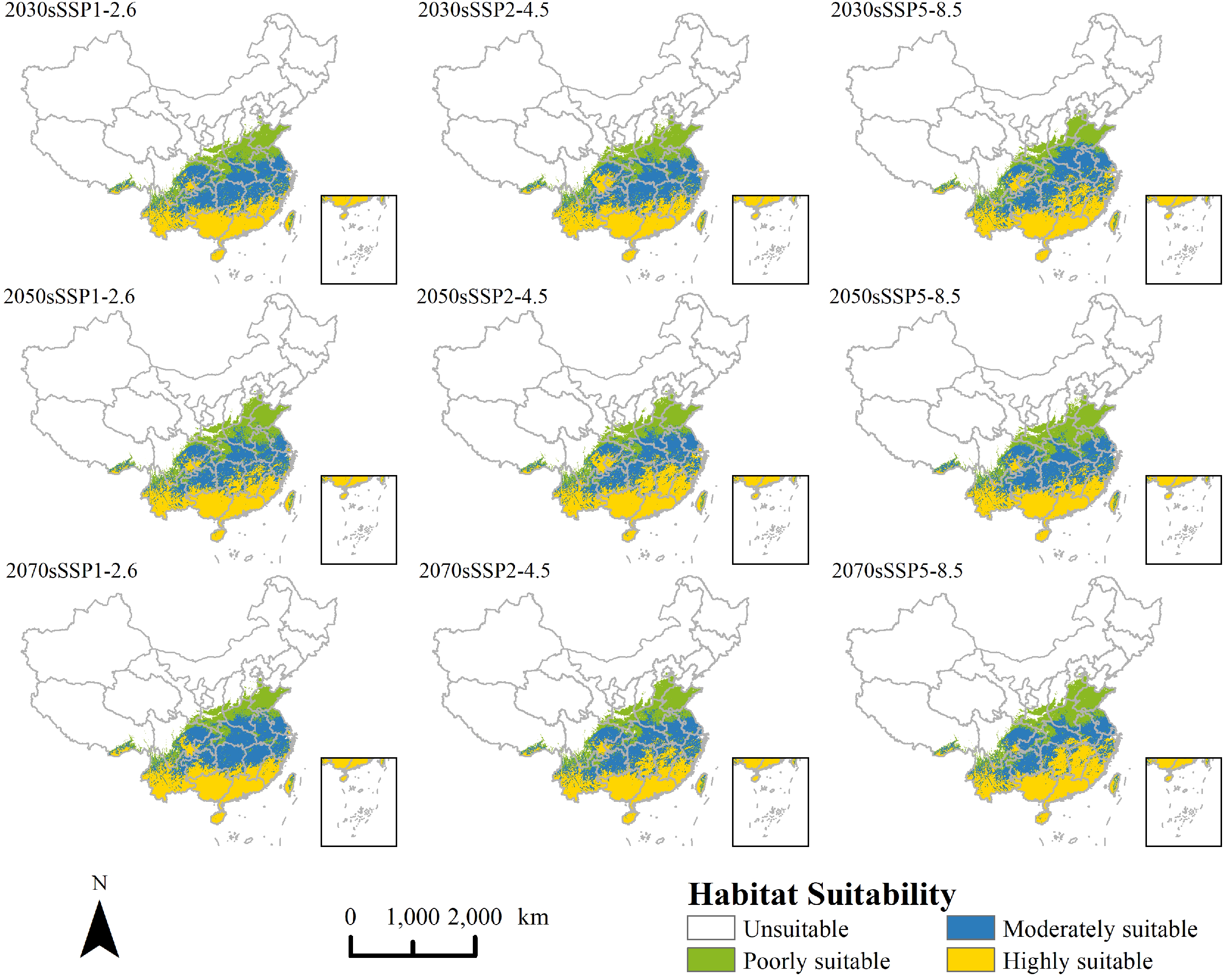 研究结果表明,银胶菊(P. hysterophorus)的扩散过程具有明显的空间格局特征,且人类活动对其在我国境内的传播具有重要影响。此外,环境变量中,年均温(bio1)和最湿月降水量(bio13)是影响银胶菊潜在分布的主导因子。在当前气候条件下,我国东南部是银胶菊最主要的潜在入侵区域;随着气候变化,其潜在分布区将向更高纬度地区扩展。森林与农田生态系统受银胶菊入侵影响尤为显著,应优先对其开展持续监测并强化管理,采取主动防控措施对遏制银胶菊进一步扩散与入侵至关重要。