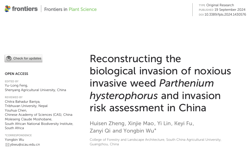 近日,林学与风景园林学院吴永彬教授团队在国际期刊Ecological Indicators(中科院一区TOP期刊,影响因子7.4)发表学术论文,这是继2024年在Frontiers in Plant Science(中科院二区TOP期刊)发表关于外来入侵植物的重要研究成果。这两项研究系统揭示了两大恶性入侵植物——银胶菊(Parthenium hysterophorus)和肿柄菊(Tithonia diversifolia)的入侵历史、扩散机制与未来风险,为全国乃至全球区域尺度的入侵物种早期预警与精准防控提供了重要的科学依据与实践指导。