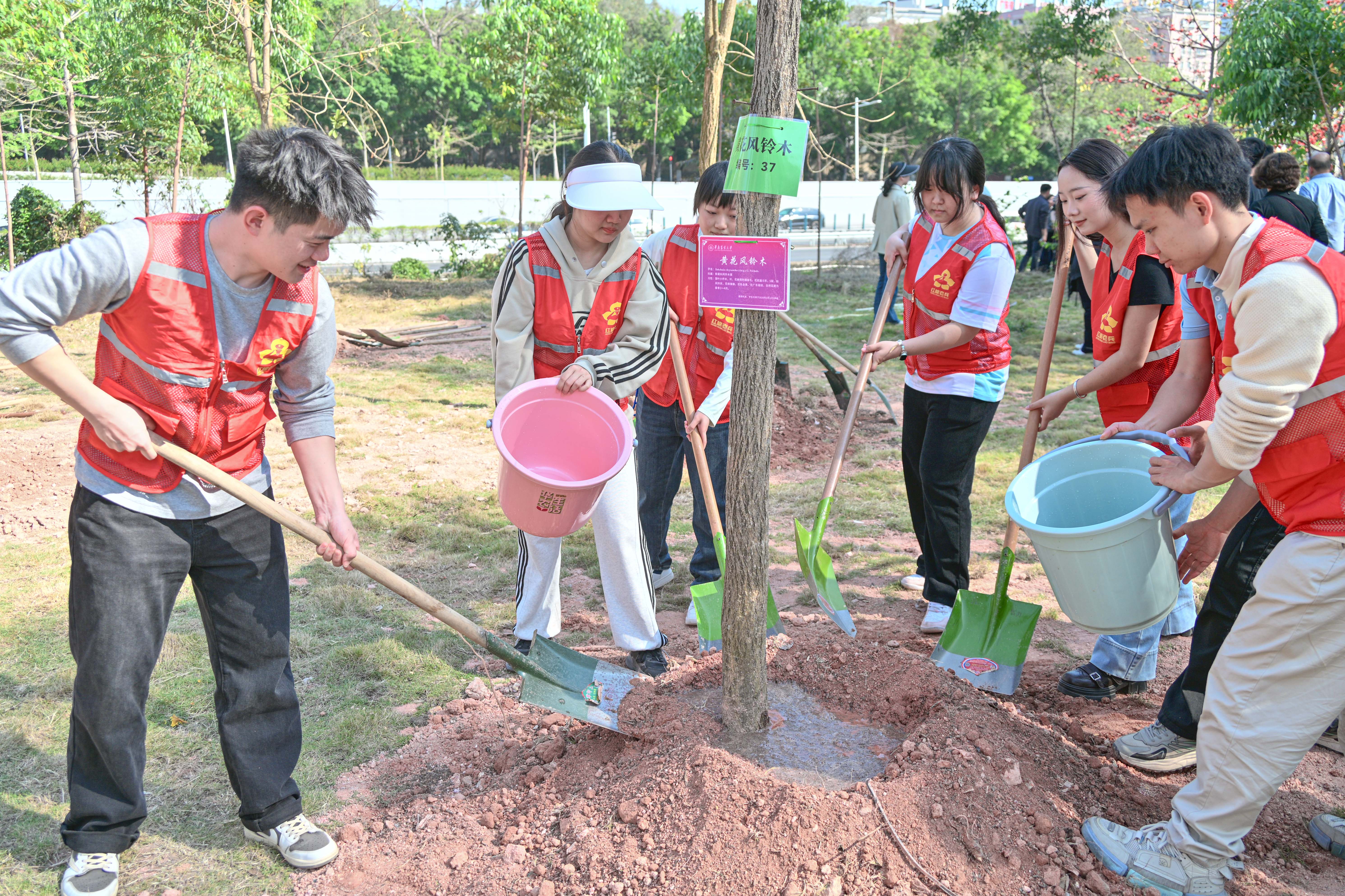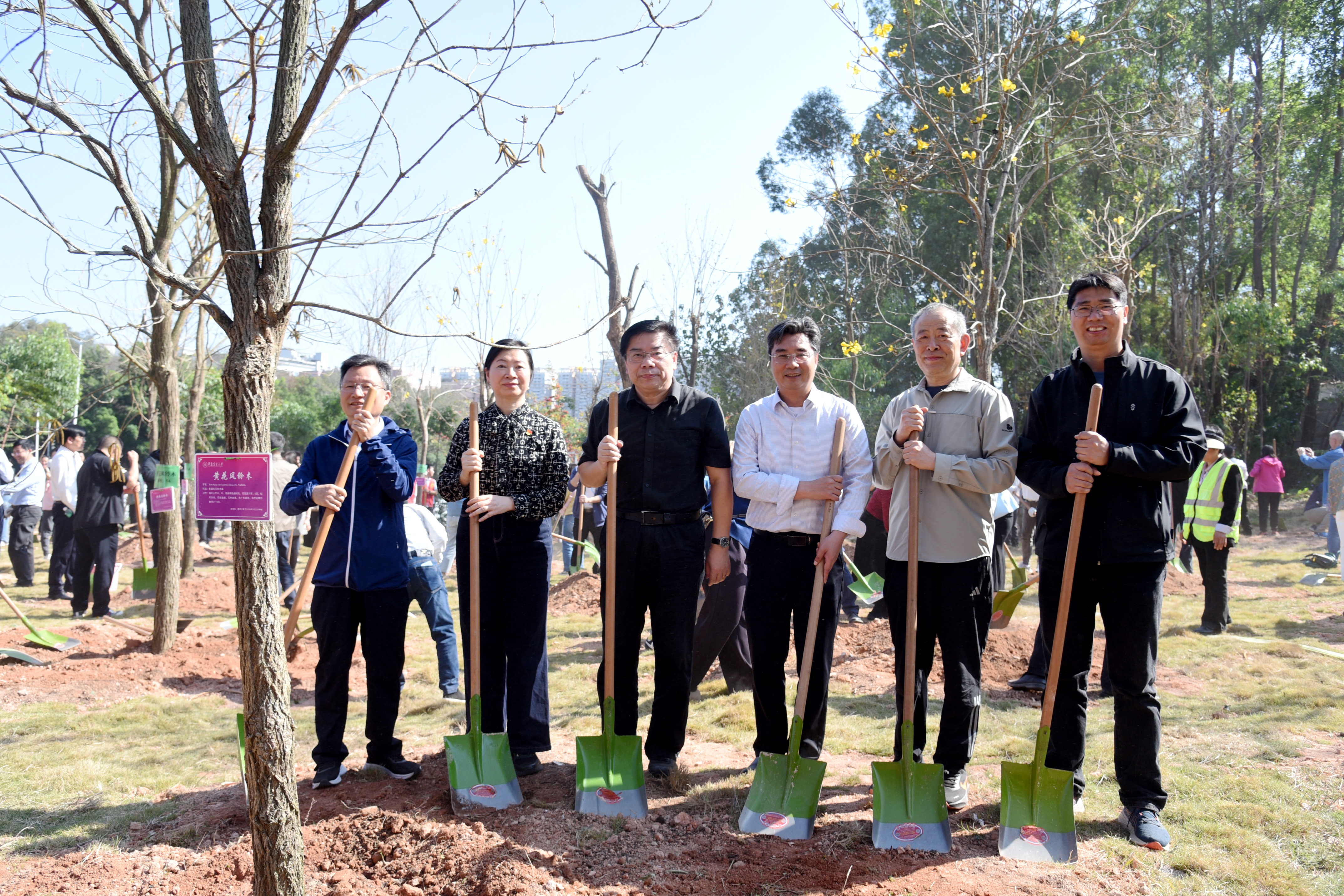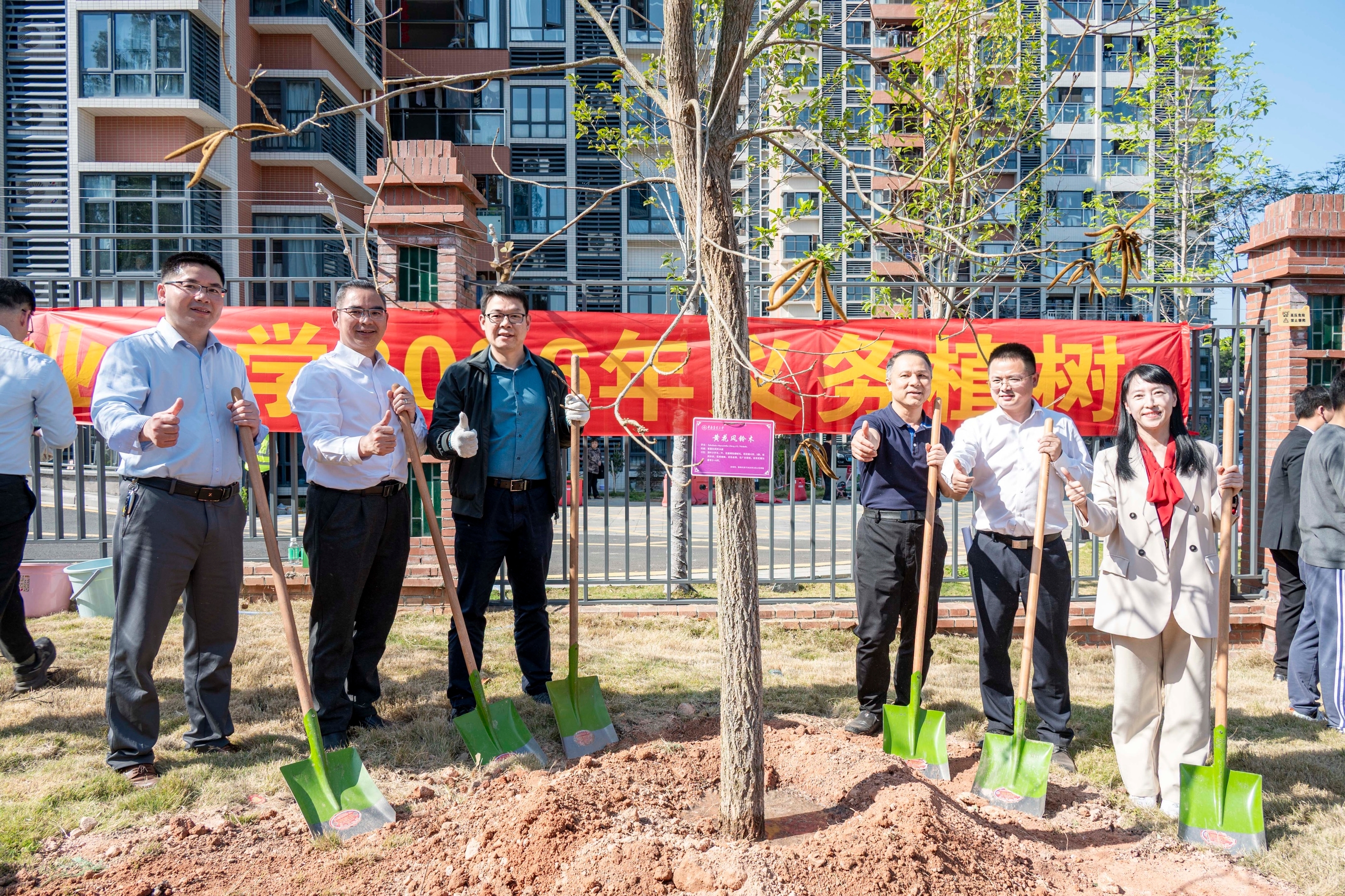 本次活动种植树苗为黄花风铃木,45株胸径10cm的壮苗中,一部分是科创大楼建设地块迁移树苗,一部分五山街道捐赠树苗,寓意邻里友谊、校友情谊与生态传承的深度融合。