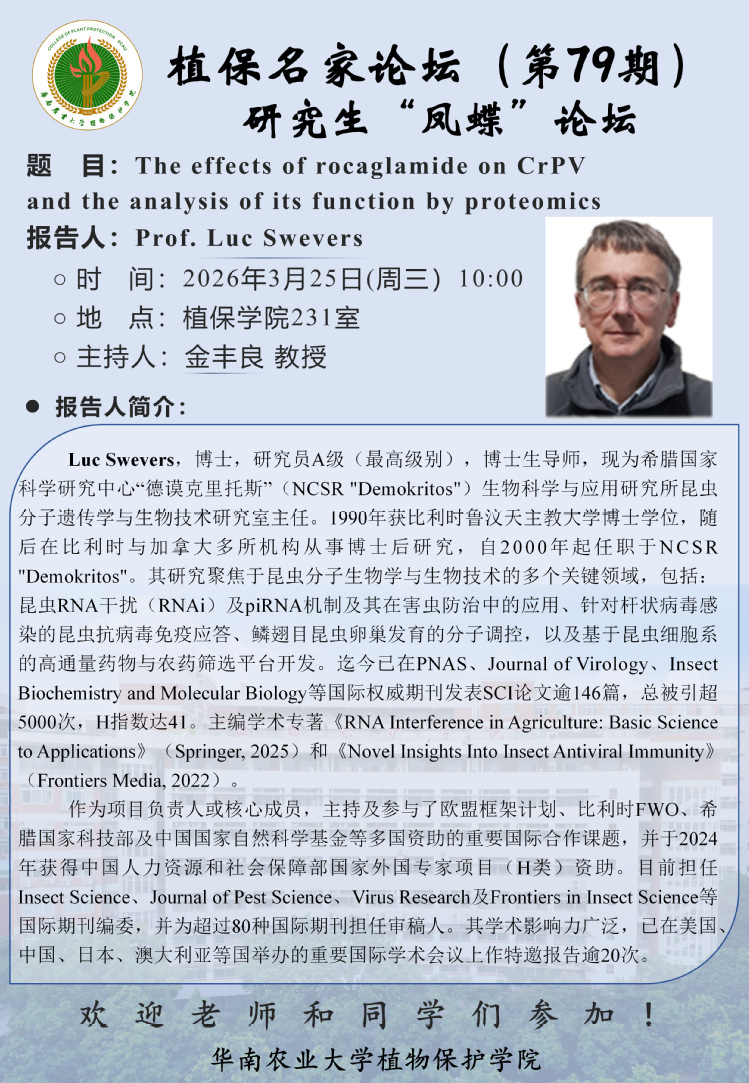 植保名家论坛(第79期):The effects of rocaglamide on CrPV and the analysis of its function by proteomics