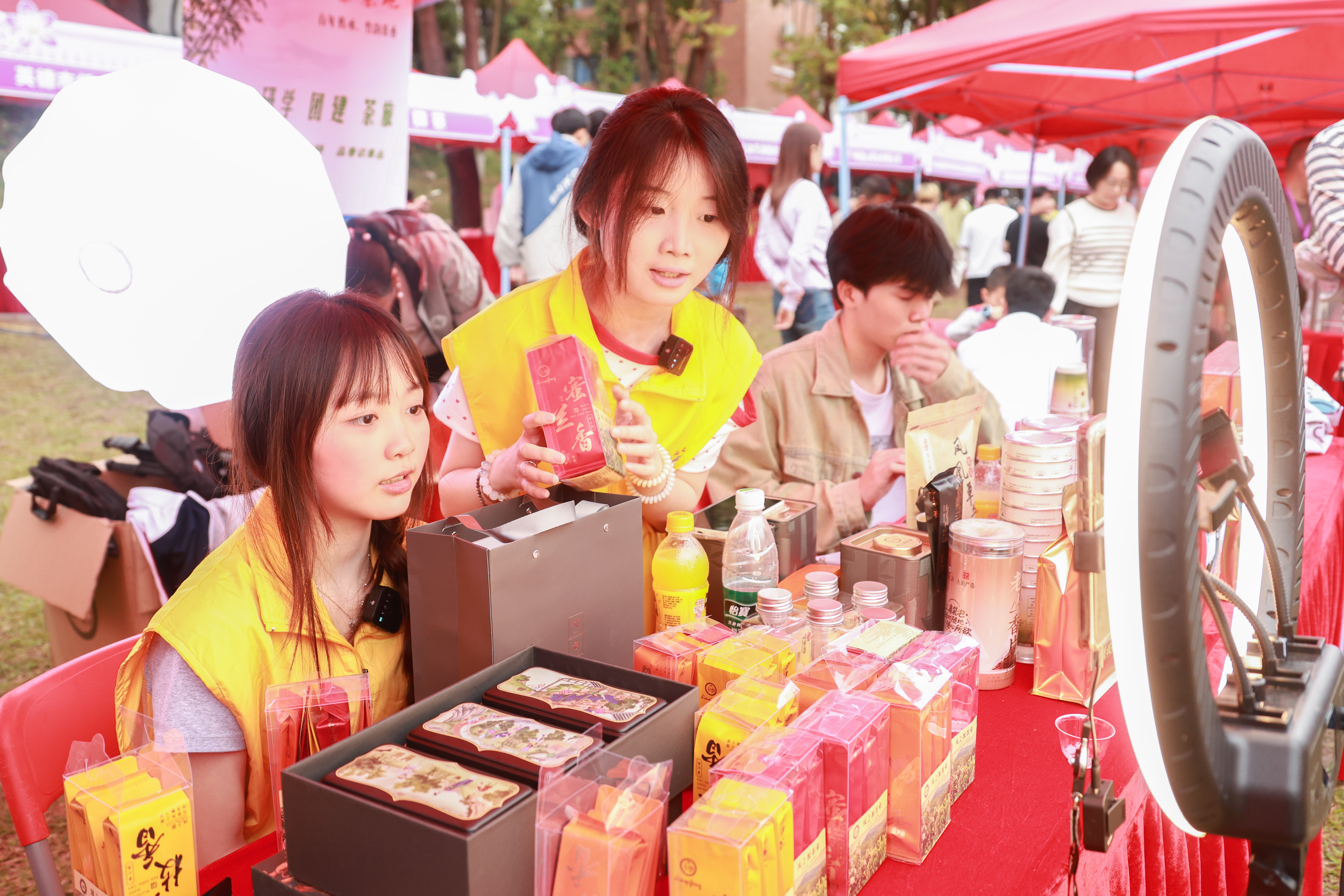 广东擂茶配鲜婆饼、广西油茶配柿子片、贵州紫茶配刺梨果冻、重庆黄精茶配上豆干、安徽石斛花茶配上铜陵白姜……3月21日,华南农业大学首届“紫荆雁归节”在学校大草坪启幕。来自粤、桂、皖、黔、渝五省(自治区、直辖市)的200余名“头雁”学员携家乡特色风物重返母校,集中展示乡村产业振兴的丰硕成果。
