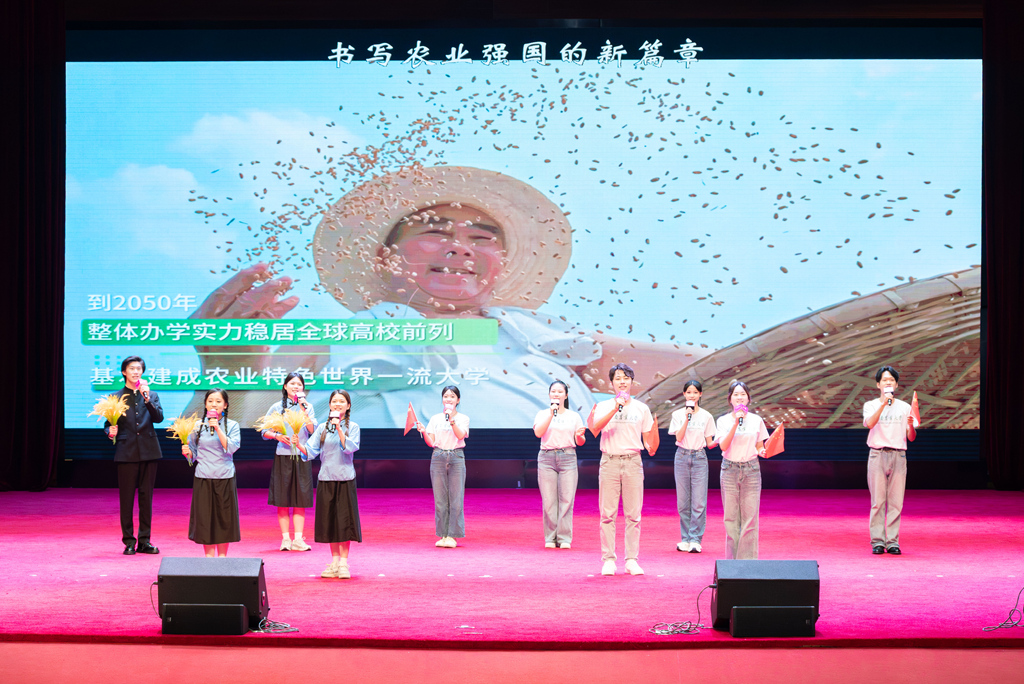 “三代人,一条路,把一生种进稻田,把精神立在大地。”“原来一颗稻种真的可以改变世界!”“过去,我们信仰如山,在战火中守护农业命脉,现在,我们使命如炬,用智慧培育乡村振兴的种苗。”学校农业科学家精神志愿宣讲团与艺术团司仪队带来了情景分享《传承百年的华农科学家精神》,动情讲述华农一代代科学家俯身田野、把论文写在大地上的百年薪火。
