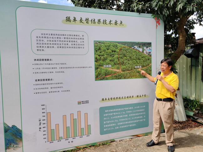 团队负责人、园艺学院教授李建国表示,针对优质晚熟荔枝大小年结果严重和管理费工费力等产业技术瓶颈问题,我校荔枝团队经过近10年的努力,创建了隔年交替结果技术模式。2024年是优质晚熟荔枝近40年不遇的特小年,全国“仙进奉”荔枝成花率不足10%,而东莞市塘厦镇韦记果园采用了隔年交替结果模式后,2024年成花枝率达到85%以上。该技术的核心是将果园一分为二,形成结果园区和休养园区,研发了当年结果树采收后不施肥不修剪,直至花芽生理分化期(12月下旬-1月中旬)进行重度回缩修剪,抑制其花芽分化,培养高光效树形,保证树体休养一年,休养树重回缩后培养4-5次梢,末次秋梢在10月底之前老熟,老熟后采用螺旋环剥控梢促花等关键技术。